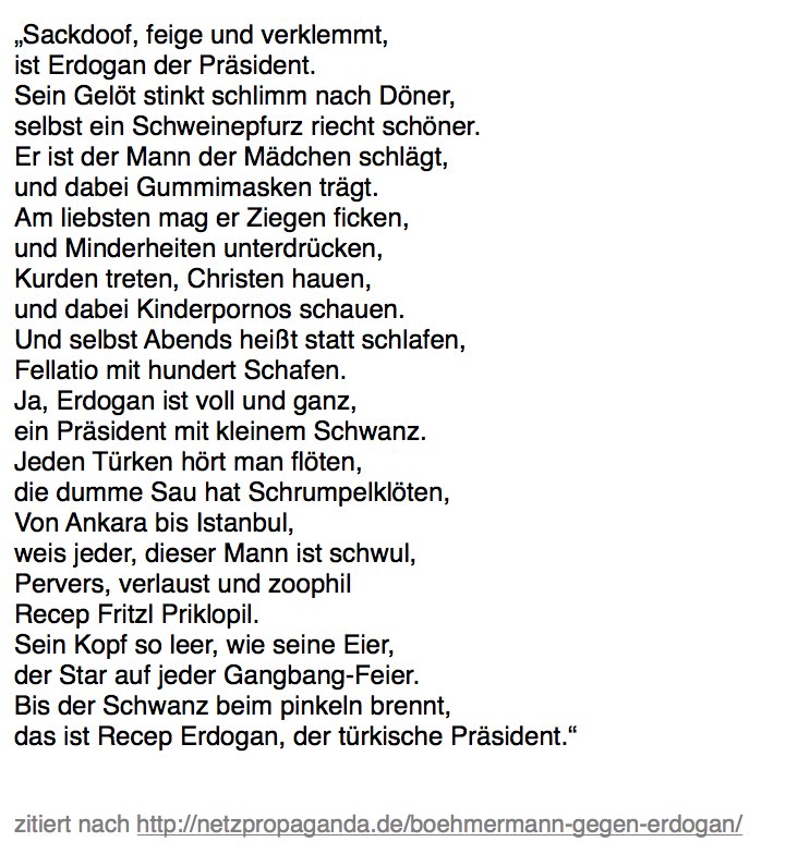 Wie der AKP-Herrscher aus der Türkei darauf reagiert, sollte als beißende Satire wahrgenommen werden; türkische Menschenrechtler freilich werden das ganz anders lesen. Ihnen dürfte wenig der Sinn nach Humor und Satire stehen. Erdoğan können wir – von hier aus gesehen – dennoch getrost brüllen lassen. Er ist indes ein gefährlicher Bursche für die Entwicklung der Türkei, wenn man unsere Vorstellungen eines freien Landes zugrunde legt. Böhmermann hingegen ist eine arme Wurst. Er geriert sich wie ein spätpubertierender Schüler, der sauer ist, immer als letzter in die Fußballmannschaft gewählt zu werden. Weil er schlecht ist. Das allerdings begreift er nicht, weil zu eitel und äußerst selbstbezogen. Dies wiederum hat er mit Erdoğan gemeinsam. Wie wäre es eigentlich, wenn Böhmermann zur Abwechslung mal ein wirklich richtig gutes Gedicht schriebe, in dem er sich entschuldigte? Jedenfalls bei all denen, die er kollektiv beleidigt hat, indem er Textbausteine lächerlicher Lacher wie ein Haudraufmännchen zusammen pappt: „Ziegen ficken … und dabei Kinderpornos schauen“ sind doch – gleichgültig für oder gegen wen auch immer – einfach krank. Auch dann, wenn man damit Lacher produzieren will und auch, wenn das alles mehrfach erläutert wird.