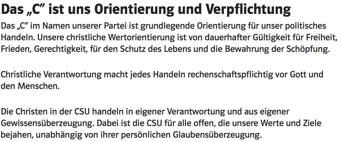 TSBN | 11. Mai 2016 Um es vorwegzunehmen: Was die Christliche Union aus Bayern in den letzten Wochen veranstaltet, ist besorgniserregend. Sprache und Duktus, das ganze Gehabe und Gewerke sind dieser Partei nicht würdig. Denn es hat nichts mit christlich zu tun; im Gegenteil ist es oftmals das Gegenteil von allem, was man landläufig mit diesem Begriff assoziiert. Die CSU trägt das „C“ so plakativ vor sich her, das man darunter zusammenbrechen könnte. Noch stärker als die CDU betonen die Bayern, das „C“ sei für sie „Orientierung und Verpflichtung“. So steht es in deren Grundsatzprogramm. Steht also als Grundsatz dort; nicht in einem Wahlprogramm für ein paar Jahre. Aber ist es das wirklich (noch), oder sind die grinsenden Populisten aus München nicht längst zynische Taktierer geworden?