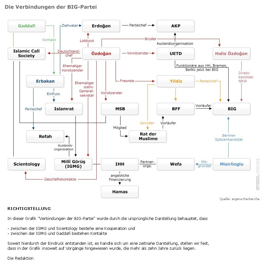 Der Verein UETD, die Union Europäisch-Türkischer Demokraten e.V., hat die Demo in Köln angemeldet: „Ja zur Demokratie. Nein zum Staatsstreich.“ Diesen Slogan trägt die Veranstaltung. Die UETD ist auf vielfältige Weise mit der AK-Partei Erdoğans verbandelt. Vor der letzten Berlin-Wahl 2011 hatte die Zeitschrift „Der Spiegel“ rund um die Partei BIG recherchiert (siehe auch Graphik weiter unten). Auch bei BIG ist die Rede von der Demokratie. Im Zusammenhang mit dem türkischen Diktator will man das gern glauben. Denn dieser versteht sich selbst offensichtlich als Demokrat. Nach dem Motto: Das Volk will die Todesstrafe, was soll ich da bloß machen? Nicht wenige fragen sich, ob er einfach ein gnadenloser Zyniker ist oder an einem pathologisch bedingten Hang zu Manipulation und Lügen leidet. Oder das eine mit dem anderen zusammenhängt.
