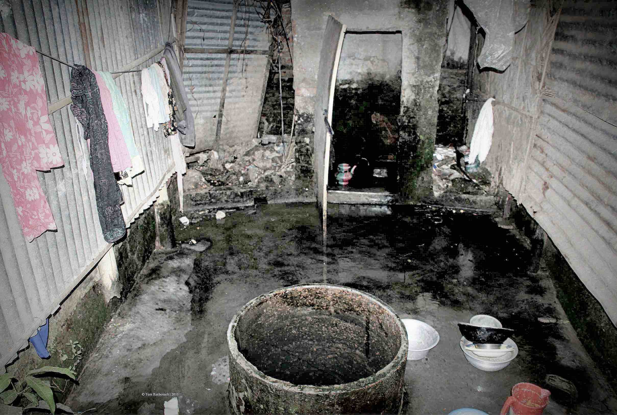 Die Familie, zu der mich Amit gebracht hat, bietet mir etwas zu trinken an. “Mögen Sie Wasser oder einen Tee? Wir machen Ihnen gern einen Tee,” sagen sie fast alle gleichzeitig. Amit erklärte, dass wir nicht so viel Zeit hätten und bald wieder zurück müssten. Das ist eigentlich sehr unhöflich. Wenn man in Bangladesch etwas angeboten bekommt, muss man es annehmen, sonst fühlen sich die Menschen verletzt. Aber sie verstehen, dass Amit und ich nicht allzu viel Zeit mitbringen, zumal es langsam dunkel wird. Und Straßenbeleuchtung im Slum ist wie Kanalisation einfach nicht vorhanden. Selbst die Stromversorgung für die Hütten, in denen die Menschen leben, ist nicht immer gewährleistet.