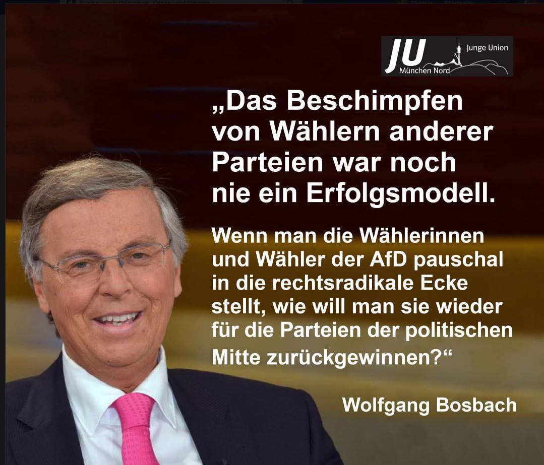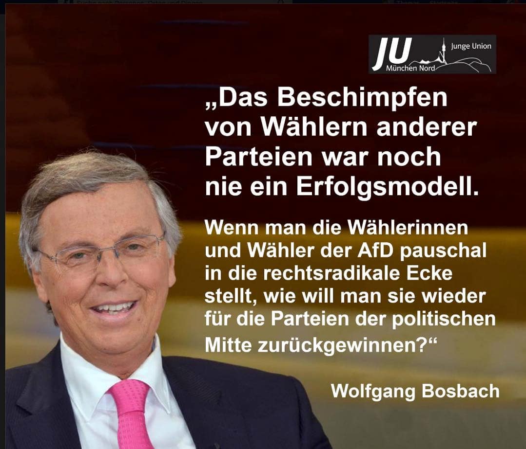 Nein, nein. Das hat er so natürlich nicht gesagt. Dazu ist er rhetorisch zu geschult. Aber dies ist die Quintessenz seiner Worte. Er hat einflussreiche Fans in der Union; so zum Beispiel in der Jungen Union in München (Nord). Das dürfte ihn freuen, den Mann, der immer weniger ernst genommen wird, seit er nicht Innenminister werden durfte. Was Bosbach offensichtlich nicht zu unterscheiden vermag sind die Begriffe „Beschimpfung“ und „Auseinandersetzung“.