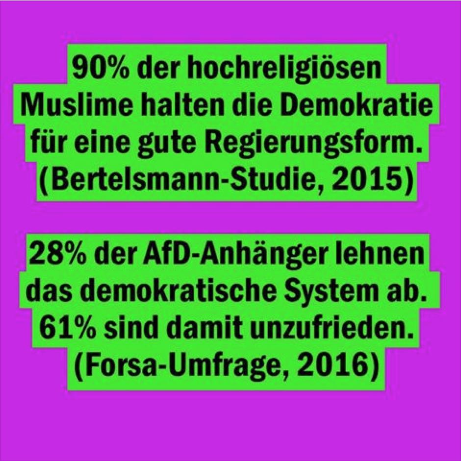 Sogenannte Angst von sogenannten „besorgten“ Bürgern. Diffuse Äußerungen von uninformierten Menschen. Dabei sind viel mehr Muslime für die liberale Demokratie als Staatsform in Deutschland. Das kann man von Anhängern der rechtsradikalen AfD nicht gerade behaupten. Jetzt aber sind die Rechten dran. Sie müssen freundlichst mitteilen, wie sie es mit der Demokratie halten – und mit dem Schutz von Minderheiten. Nicht nur andere Parteien müssen sie stellen. Auch die Medien. Und gefälligst auch jeder einzelne Bürger. Schließlich ist nicht jeder ein so unglaublich verständnisvoller Typ wieder der rheinische Katholik Bosbach von der CDU. Der ist vor allem bekannt aus den zahllosen Talkrunden im Fernsehen.