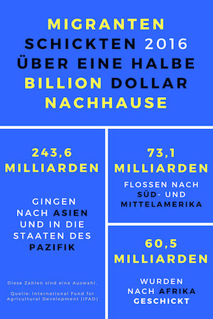 Dazu müssten wir bloß etwas von dem abgeben, was wir selbst besitzen. In einem anderen Artikel werde ich diese Vorstellungen einmal detaillierter ausführen. Jedenfalls geben Millionen Flüchtlinge und Migranten viel von dem wieder ab, was sie in der Ferne verdienen (siehe Grafik) und schicken fast eine halbe Billion Dollar nachhause. Dadurch können ihre Familien ein besseres Leben führen. Die reichen Ländern geben viel zu wenig her für würdiges Leben auf anderen Kontinenten als ihren eigenen. Oft liegen diese reichen Länder im sogenannten „Christlichen Abendland“.
