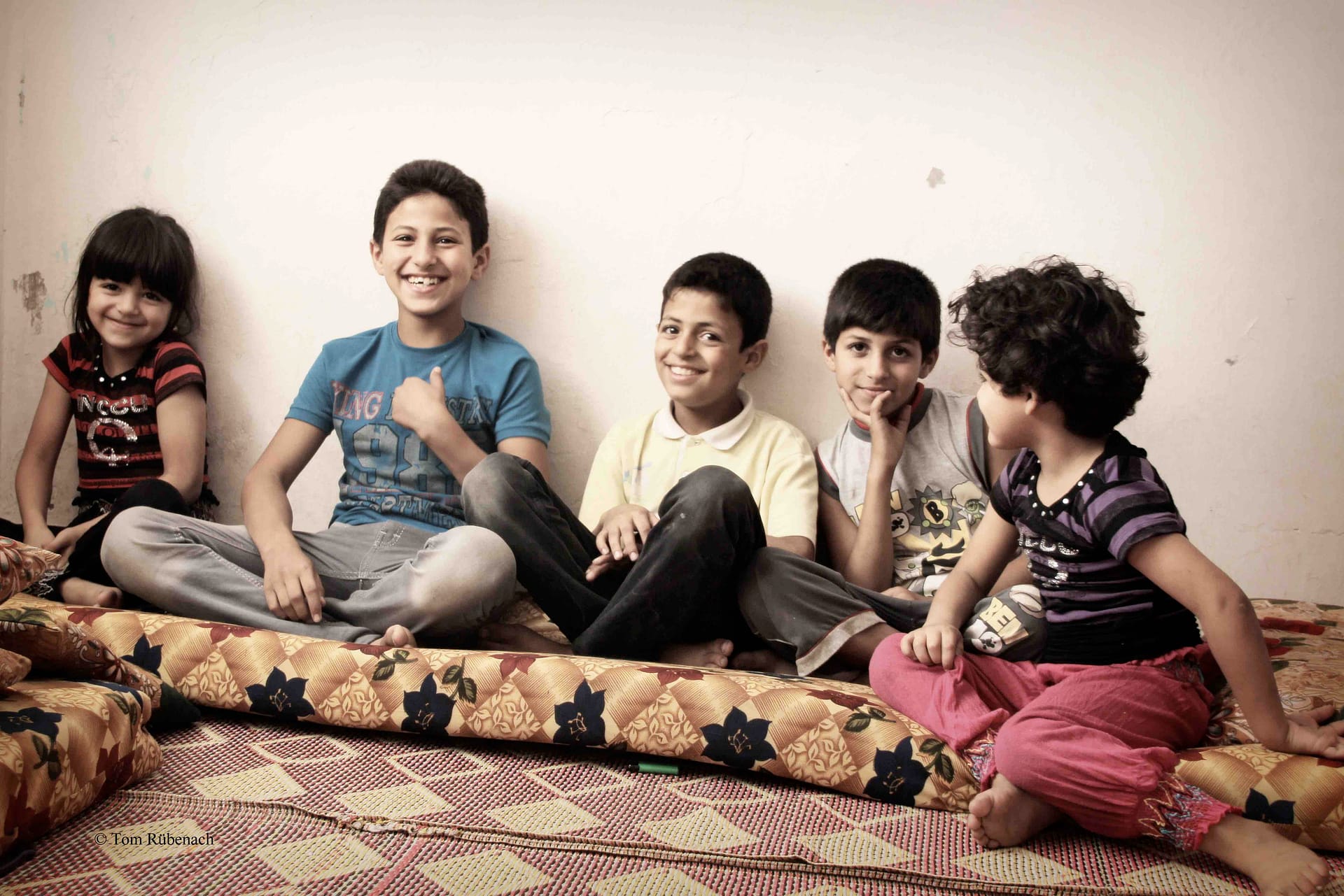 Meine Begleiterin aus der im östlichen Jordanien gelegenen Stadt Mafraq klopft mit ihrem Fingerring an die Tür. Nochmal und nochmal. Niemand öffnet. Erst, als sie aus dem Flur in die Wohnung anruft, wird es plötzlich mucksmäuschenstill. Farak öffnet uns die Tür. Sie lächelt, als sie die Sozialarbeiterin sieht, die mich und Eman, eine Freundin aus Amman, begleitet. Die Frauen kennen sich. Sie waren sich begegnet an dem Tag, an dem Farak als Flüchtling diese Wohnung zugewiesen worden war. Hier leben auf vielleicht 50 Quadratmetern acht Menschen. Faraks Mutter und ihr Cousin sind mit ihr hier, außerdem ihre fünf Kinder. Die sind zwischen fünf und elf Jahren alt. Farak hat wunderschöne große Augen, die stets offen und interessiert am Gespräch teilnehmen. Ihre schlanken Hände streicheln den Krauskopf der Kleinsten, die es sich in ihrem Schoß gemütlich gemacht hat. Unter ihrer Kopfbedeckung lugt ein Teil des schwarzen Haupthaares hervor, das sie wieder und wieder nach hinten schiebt, so dass man es nicht sehen kann. Die Kinder haben sich im „Wohnzimmer“ verteilt. Das hat keine Sessel, keinen Tisch, keine Stühle. An den Wänden gibt es keine Bilder, nur einige Nägel, die als Garderobenhalter dienen könnten. Ein schlichter Plastikteppich und – entlang der Wände – Schaumstoffmatratzen, die als Sitzgelegenheiten dienen. Ach ja, und ein paar Kissen, die gibt es auch. Die Küche, fast eins mit dem Wohnzimmer, ist sehr einfach. Ein Gasherd mit vier Kochstellen und ein kleiner Kühlschrank, viel zu klein für so eine große Familie. So lebt Farak mit ihrer Familie hier in Mafraq.