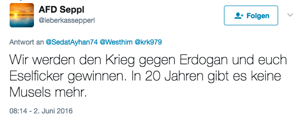 Nein, Besorgnis ist da nicht. Da ist so viel blinder Hass, dass es einen ekelt. Alles, was nicht „deutsch“ ist, muss weg. „Major Pilot“, ein Sympathisant der Rechten, schrieb, als fast das ganze Land für die Freilassung von Deniz Yücel kämpfte: „Hoffe, der verrottet im türkischen Knast!“ Die sog. AfD ist in Wirklichkeit eine Alternative für (intellektuell) Abgehängte. Gewiss nicht für unsere liberale Demokratie.